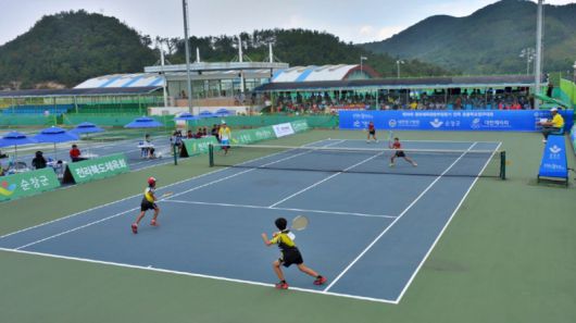 순창공설운동장 실내 다목적구장에서 열린 전국 유소년 소프트테니스 대회에 참가한 선수들이 경기를 펼치고 있다. [사진=순창군] |