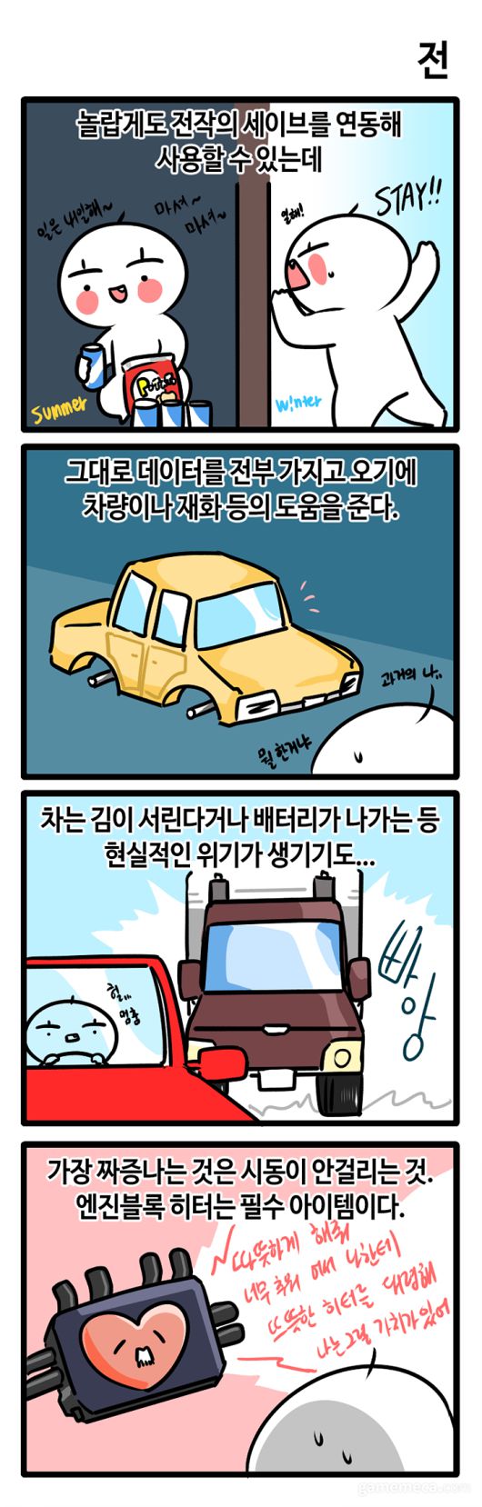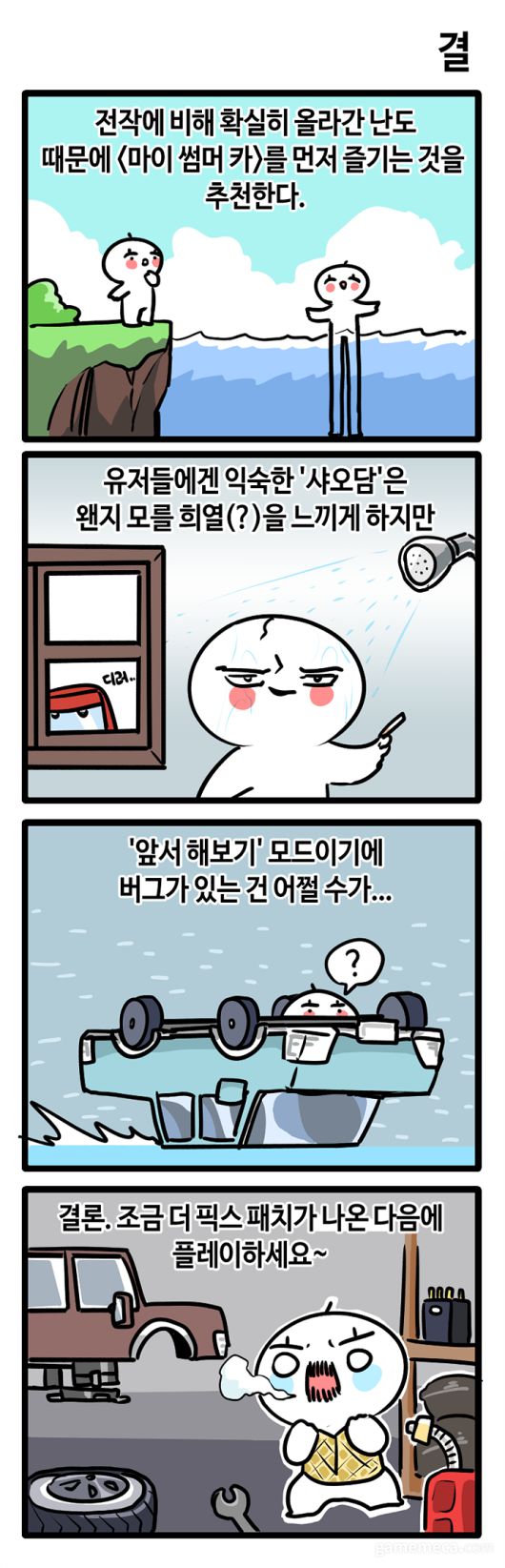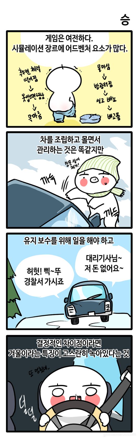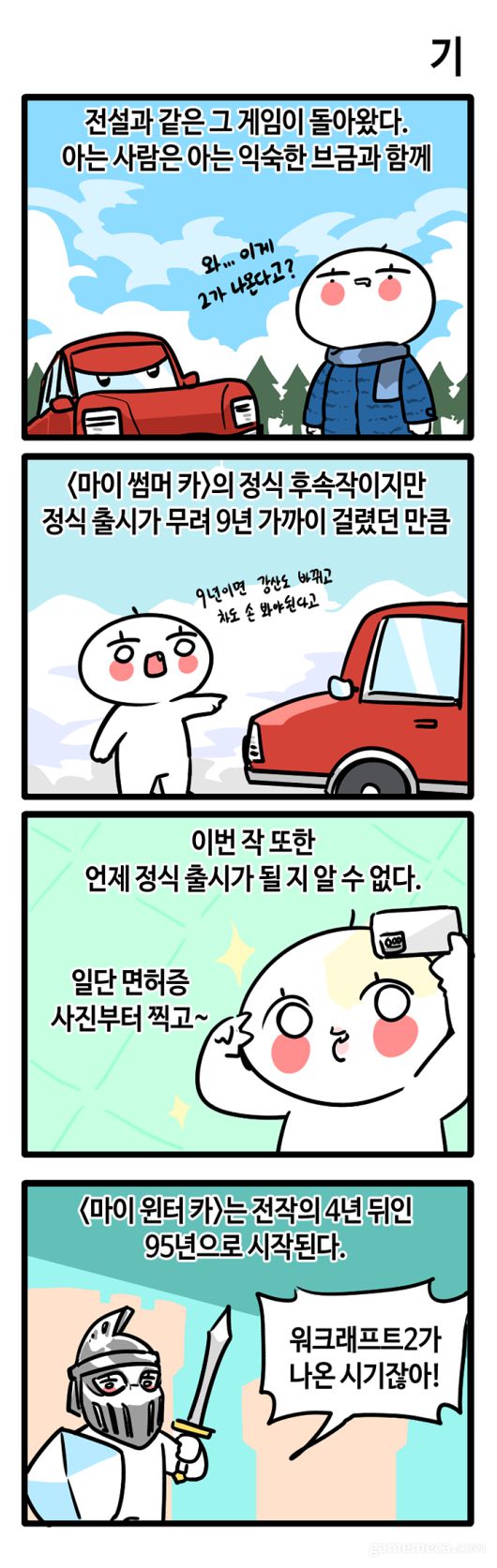[게임찍먹], [징징징], [이웃집 D바] 등을 그린 웹툰작가 쌀신이 게임메카 리뷰툰 [기승전결]로 돌아왔습니다. 바쁜 현대인들을 대신해 최신 게임들을 플레이해보고, 최대한 간결한 정보와 함께 장점, 단점, 매력 등을 소개합니다. 이번에 알아볼 신작은 위대한 자동차 시뮬레이터 '마이 썸머 카'의 후속작 '마이 윈터 카'입니다. 겨울의 혹독함, 강렬한 현실성, 특유의 불친절함의 결합은 기묘한 게임성을 완성합니다