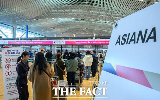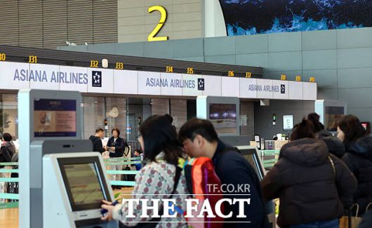 [더팩트ㅣ인천국제공항=남윤호 기자] 아시아나항공이 인천국제공항 제2터미널로 이전 운항을 개시한 14일 오전 인천국제공항 2터미널 아시아나항공 체크인 카운터에서 승객들이 탑승 수속을 위해 줄을 서고 있다.