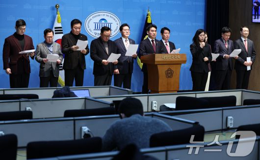 (서울=뉴스1) 김도우 기자 = 국민의힘 당내모임인 대안과미래 의원들이 14일 서울 여의도 국회 소통관에서 윤리위의 한동훈 전 대표 제명 결정에 대한 입장을 밝히고 있다. 2026.1.14/뉴스1pizza@news1.krCopyright ⓒ 뉴스1. All rights reserved. 무단 전재 및 재배포, AI학습 이용 금지.