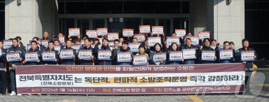 (전주=뉴스1) 유경석 기자 = 민주노총 전국공무원노조 전북소방지부 관계자들이 14일 전북 전주시 전북특별자치도청 앞에서 \'인사 비리 척결 및 전면수사 촉구\' 기자회견을 하고 있다. 2026.1.14/뉴스1
