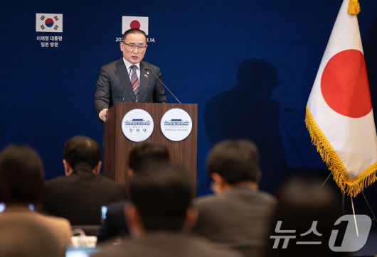 (오사카(일본)=뉴스1) 이재명 기자 = 위성락 국가안보실장이 14일 일본 오사카에 마련된 대한민국 프레스센터에서 한일 정상회담 등 주요 성과 관련 브리핑을 하고 있다. 2026.1.14/뉴스1