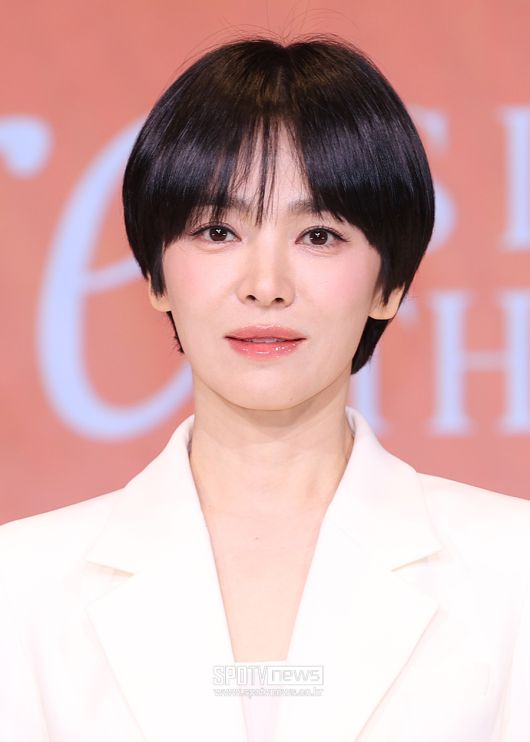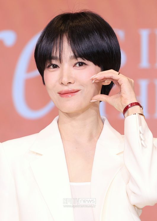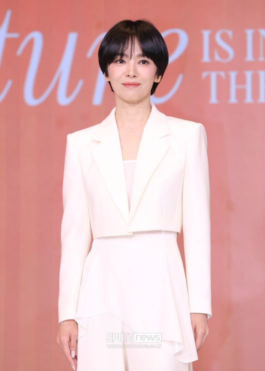 이날 송혜교는 크롭 재킷과 와이드 팬츠로 완성한 화이트 셋업으로 우아한 미모를 뽐냈다.