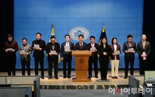 아시아투데이 이병화 기자 = 국민의힘 소장파 초재선 모임 '대안과 미래' 소속 의원들이 14일 국회 소통관에서 기자회견을 열고 한동훈 전 대표 제명 관련 입장표명 및 의원총회 개최를 촉구하고 있다.