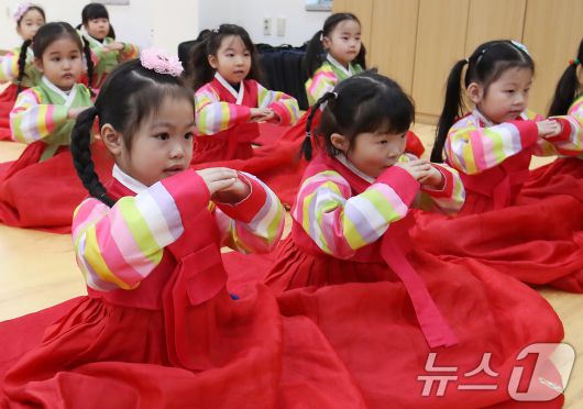 (부산=뉴스1) 윤일지 기자 = 설 명절을 한 달가량 앞둔 14일 부산 동래구 충렬사 안락서원 교육회관에서 열린 '어린이 전통예절교실'에서 한복을 곱게 차려 입은 유치원생들이 큰절하는 법을 배우고 있다. 2026.1.14/뉴스1