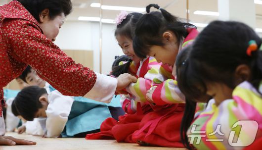 (부산=뉴스1) 윤일지 기자 = 설 명절을 한 달가량 앞둔 14일 부산 동래구 충렬사 안락서원 교육회관에서 열린 '어린이 전통예절교실'에서 한복을 곱게 차려 입은 유치원생들이 큰절하는 법을 배우고 있다. 2026.1.14/뉴스1yoonphoto@news1.krCopyright ⓒ 뉴스1. All rights reserved. 무단 전재 및 재배포, AI학습 이용 금지.