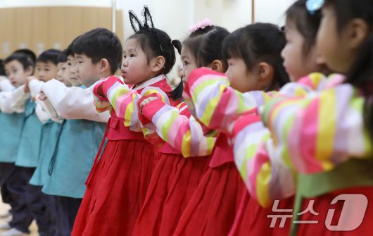 (부산=뉴스1) 윤일지 기자 = 설 명절을 한 달가량 앞둔 14일 부산 동래구 충렬사 안락서원 교육회관에서 열린 '어린이 전통예절교실'에서 한복을 곱게 차려 입은 유치원생들이 큰절하는 법을 배우고 있다. 2026.1.14/뉴스1