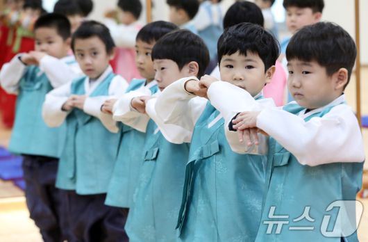 (부산=뉴스1) 윤일지 기자 = 설 명절을 한 달가량 앞둔 14일 부산 동래구 충렬사 안락서원 교육회관에서 열린 '어린이 전통예절교실'에서 한복을 곱게 차려 입은 유치원생들이 큰절하는 법을 배우고 있다. 2026.1.14/뉴스1