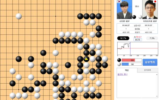 신민준 9단이 개전 3시간 만에 인공지능 승률 92%를 돌파했다. 한국기원 기보 뷰어(사이버오로) 캡처 |