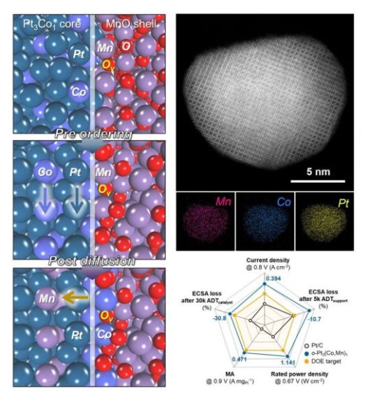 연구팀은 이러한 한계를 극복하기 위해 백금(Pt)-코발트(Co)-망간(Mn)으로 구성된 삼원계 인터메탈릭 나노촉매를 새롭게 설계했다. 촉매와 산화물 사이 계면에서 형성되는 산소 결함(oxygen vacancy)을 활용해 촉매 내부의 원자 배열을 제어하는 전략을 도입, 기존에는 구현이 어려웠던 삼원계 Pt 기반 인터메탈릭 구조를 안정적으로 구현하는 데 성공했다.