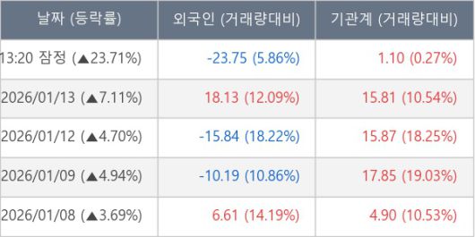 [서울=뉴스핌] 로보뉴스 = 14일 13시 30분 현재 한화(000880)는 전일 대비 23.71% (현재가 126,800원) 상승했고, 기관이 최근 5일 연속 순매수(누적 55.53만 주, 잠정) 행진을 하고 있다.