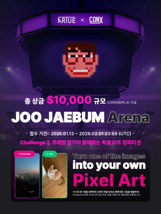 [서울=뉴스핌] 양태훈 기자 = 글로벌 블록체인 메인넷 '콘엑스(CONX·구 XPLA)'는 픽셀 아티스트 주재범과 웹3 아트 프로젝트 '주재범 아레나(JOO JAEBUM Arena)'를 진행한다고 14일 밝혔다.