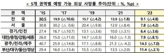 광주·전라·제주 권역도 2021년 21.3%에서 2023년 14.3%로 7.0%p 개선을 보였으며, 서울 4.2%p(12.0%→7.8%), 부산·대구·울산·경상 2.1%p(13.5%→11.4%) 등 모든 권역에서 예방 가능한 외상 사망률이 개선됐다.
