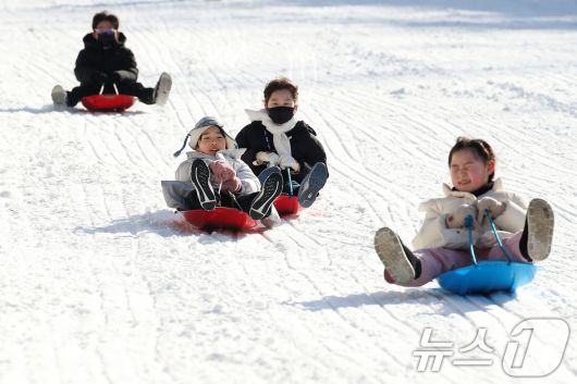 (대구=뉴스1) 공정식 기자 = 한파가 기승을 부린 14일 대구 달서구 테마파크 이월드를 찾은 어린이들이 눈썰매장에서 눈썰매를 타며 즐거운 시간을 보내고 있다. 2026.1.14/뉴스1