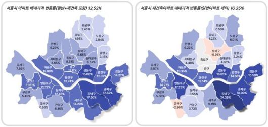 부동산R114 집계로는 지난해 서울 전체 기준 아파트 매매가격이 전년 말 대비 12.52% 상승했다. 송파구(17.52%)와 강남구(17.50%)가 각각 17%를 웃돌며 높은 상승률을 기록했다.