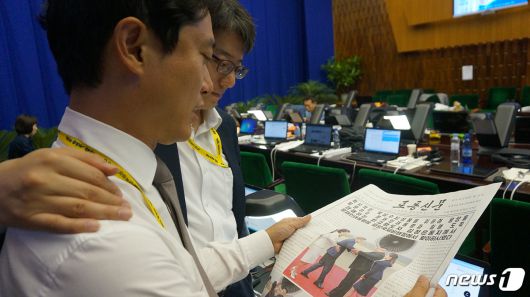 지난 2018년 남북 정상회담 당시 평양 프레스센터에서 한국 취재진이 북한 노동신문을 보고 있는 모습 . (청와대 제공) 2018.10.2/뉴스1 |