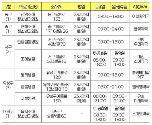 대전시 달빛어린이집 지정 의료기관 현황. 대전시 제공 |