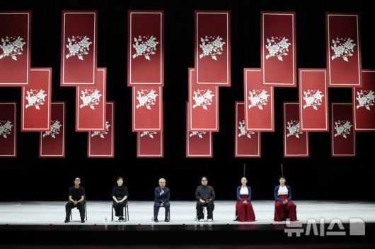 [서울=뉴시스] 박진희 기자 = 서울시무용단 '일무(佾舞)' 안무가 김성훈(왼쪽부터), 정혜진, 세종문화회관 안호상 사장, 연출 정구호, 무용수 김경애 최태헌이 21일 서울 종로구 세종문화회관에서 서울시무용단 '일무' 시연을 마치고 기자간담회를 하고 있다. 이번 공연은 국가무형문화제이자 유네스코 유네스코 세계인류무형문화유산인 '종묘제례악'의 의식무인 일무를 현대적 감각으로 재해석한 작품이다. 2025.08.21. pak7130@newsis.com |