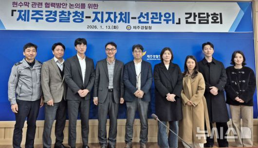 [제주=뉴시스] 제주경찰청이 13일 청사에서 제주도선거관리위원회, 제주시, 서귀포시 관계자 등과 함께 불법 현수막 관련 협력방안 논의를 위한 간담회를 열고 기념사진을 찍고 있다. (사진=제주경찰청 제공) 2026.01.14. photo@newsis.com |