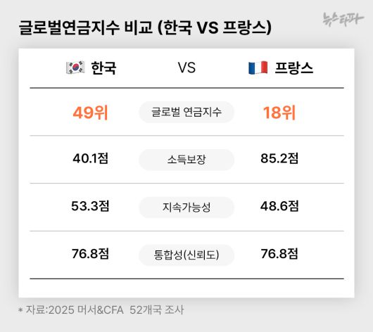 프랑스는 연금개혁을 놓고 정권의 명운이 흔들릴 정도의 위기를 맞았지만 연금제도 자체만 봤을 때 한국보다 훨씬 좋은 평가를 받고 있다.