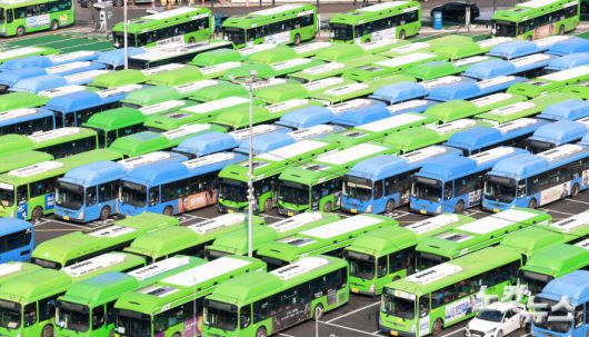 서울 시내버스 파업 이틀째인 14일 서울 한 버스공영차고지에 서울 시내 버스들이 주차돼 있다.