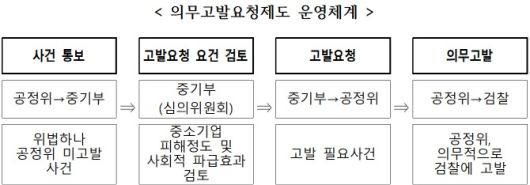 의무고발요청제도는 공정위가 고발하지 않은 6개 법률 위반사건에 대해 중기부가 중소기업에 미친 피해나 사회적 파급효과 등을 고려해 고발 요청하면 공정위는 의무적으로 검찰에 고발하는 제도다.