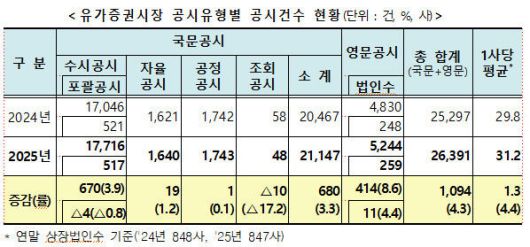 유가증권시장 상장사들의 적극적 공시 기조 유지로 국문공시와 영문공시가 각각 3.3%(680건), 8.6%(414건) 늘어났다. 특히 영문공시는 1단계 의무화 시행 첫해인 2024년 대비 공시건수와 제출법인 수(4.4%)가 모두 늘어 글로벌 투자자의 정보 접근성 제고에 기여했다는 평가다.