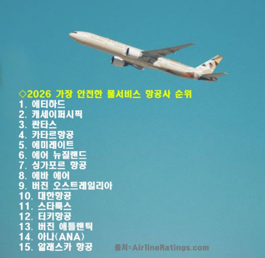 호주 기반 항공 안전 평가 기관 '에어라인 레이팅스닷컴(AirlineRatings.com)'은 2026 세계에서 가장 안전한 항공사 순위를 발표했다. 이번 평가는 320개 항공사를 대상으로 항공 당국의 감사, 사고 및 중대 사건 기록, 안전 프로그램, 조종사 훈련, 항공기 평균 연령 등을 종합적으로 고려해 이뤄졌다.