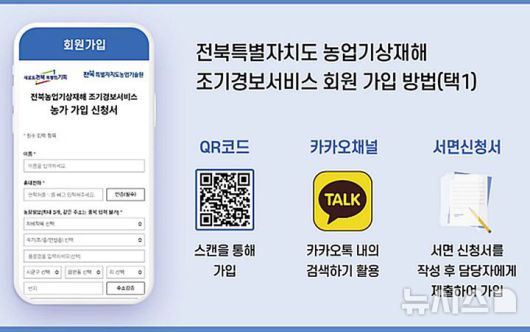조기경보서비스 신청은 QR코드 스캔과 카카오톡 채널 가입을 통한 온라인 신청은 물론, 스마트폰 사용이 어려운 농업인을 위한 서면신청까지 병행해 농업인의 이용 편의성을 높였다.