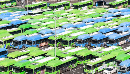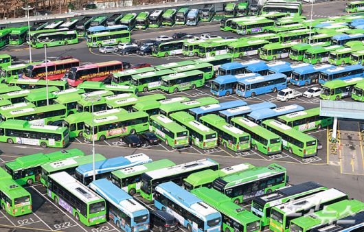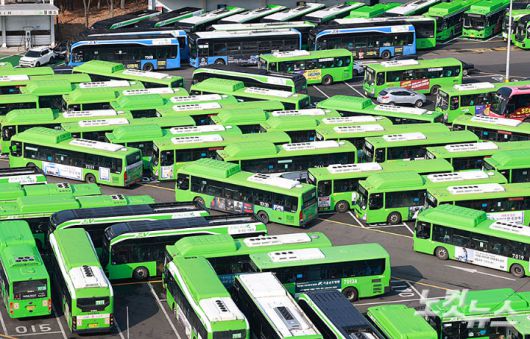 서울 시내버스 파업 이틀째인 14일 서울 한 버스공영차고지에 서울 시내 버스들이 주차돼 있다.