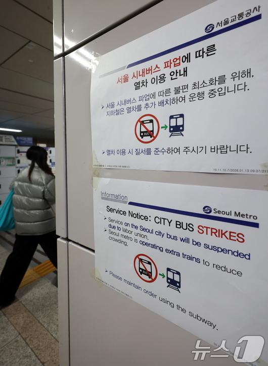 (서울=뉴스1) 황기선 기자 = 서울 시내버스 총파업 이틀차인 14일 서울시내 한 지하철 역사에 '열차 추가 운행 안내문'이 붙어 있다. 2026.1.14/뉴스1