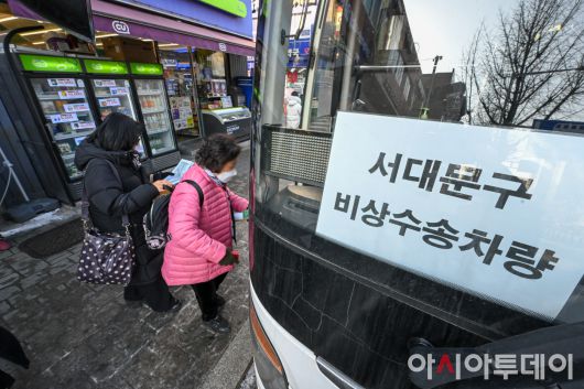 서울 시내버스 파업 이틀째인 14일 서울 서대문구 한 버스정류장에서 시민들이 주요 거점과 지하철역을 연결하는 서대문구 비상수송차량에 오르고 있다. /정재훈 기자