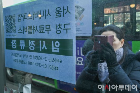 서울 시내버스 파업 이틀째인 14일 서울 서대문구의 한 버스정류장에서 한 시민이 주요 거점과 지하철역을 연결하는 서대문구 무료셔틀버스 QR코드를 확인하고 있다. /정재훈 기자