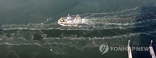 (인천=연합뉴스) 임순석 기자 = 강추위가 이어진 14일 인천 서구 경인아라뱃길에서 한국수자원공사 소속 쇄빙선이 뱃길을 내기 위해 얼음을 깨고 있다. 2026.1.14