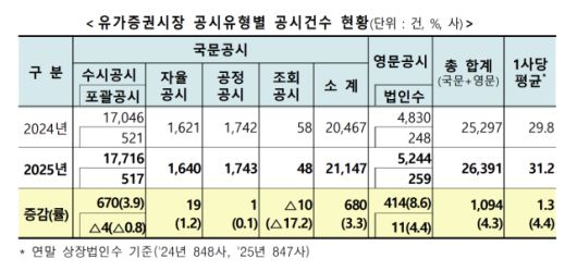 14일 한국거래소에 따르면 지난해 유가증권시장 상장법인의 전체 공시 건수는 2만 6391건으로 전년 대비 4.3% 증가했다. 상장사 한 곳당 평균 공시 건수도 31.2건으로 1년 새 1.3건 늘었다. 코스닥시장 역시 전체 공시 건수가 2만 5138건으로 5.4% 증가하며 공시 활동이 확대됐다.