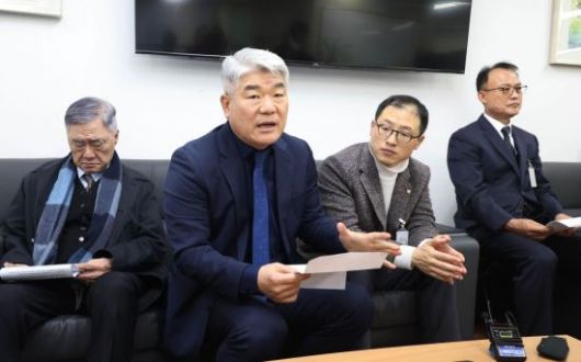 김진향 한반도평화경제회의 의장이 14일 서울 종로구 정부서울청사 통일부 기자실을 찾은 남북경협기관 및 단체장들과 함께 ‘남북관계 신뢰회복, 평화복원 기자회견’을 하고 있다. <ⓒ투자가를 위한 경제콘텐츠 플랫폼, 아시아경제(www.asiae.co.kr) 무단전재 배포금지>