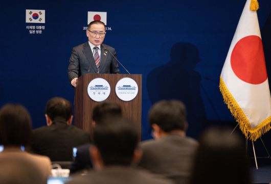 위성락 국가안보실장이 14일 일본 오사카에 마련된 대한민국 프레스센터에서 한일 정상회담 관련 주요성과 브리핑을 하고 있다. 연합뉴스 |