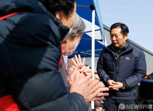 [당진=뉴스핌] 윤창빈 기자 = 정청래 더불어민주당 대표가 14일 충남 당진시 백석올미마을을 방문해 마을 할머니들과 노래를 부르고 있다. 2026.01.14 pangbin@newspim.com
