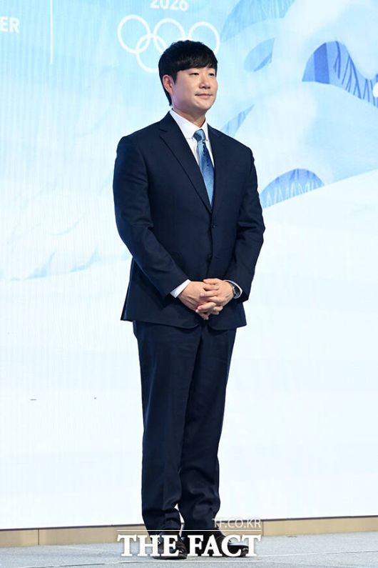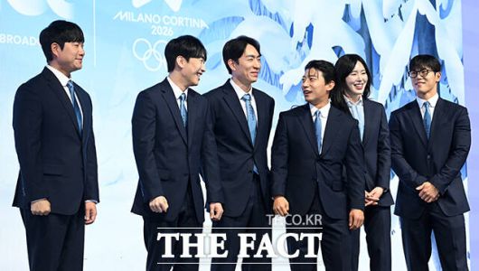 [더팩트ㅣ서예원 기자] 배성재 아나운서와 성승헌 캐스터, 이승훈, 곽윤기, 김아랑, 윤성빈 해설위원(왼쪽부터)이 14일 오후 서울 영등포구 페어몬트 앰배서더 서울 그랜드볼룸에서 열린 JTBC '2026 밀라노 코르티나 동계올림픽' 기자간담회에 참석해 포즈를 취하고 있다.