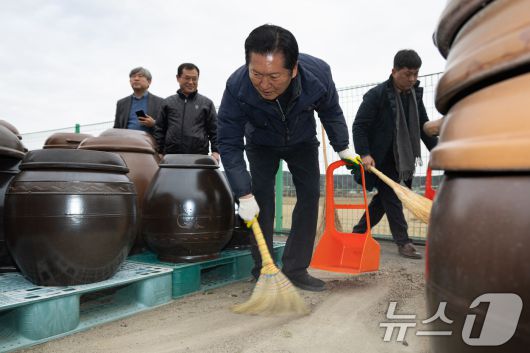 (당진=뉴스1) 유승관 기자 = 정청래 더불어민주당 대표가 14일 충남 당진시 백석올미마을기업을 방문해 장독 옮기기 작업을 하고 있다. 2026.1.14/뉴스1