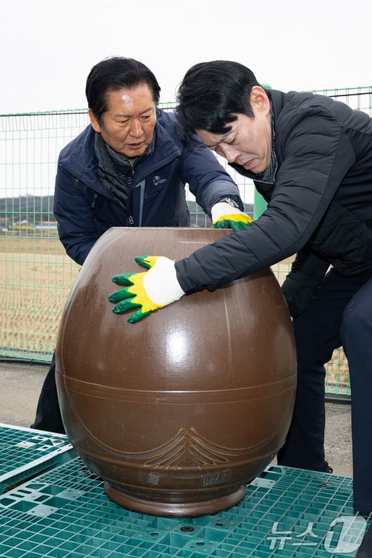 (당진=뉴스1) 유승관 기자 = 정청래 더불어민주당 대표가 14일 충남 당진시 백석올미마을기업을 방문해 장독 옮기기 작업을 하고 있다. 오른쪽은 한민수 당대표 비서실장. 2026.1.14/뉴스1