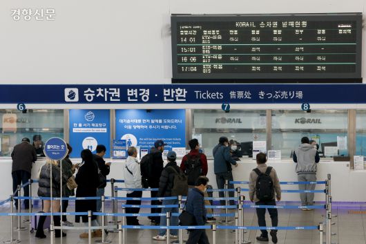 설 연휴 KTX·SRT 승차권 예매가 시작된 지난 6일 서울역에서 시민들이 승차권을 구입하고 있다. 문재원 기자 |