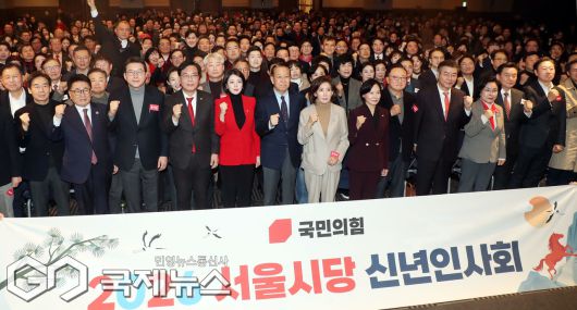 (서울=국제뉴스) 국민의힘 송언석 원내대표, 배현진 서울시당위원장, 서울지역 국회의원, 구청장, 당협위원장 등 당원들이 14일 오전 서울 여의도 중소기업중앙회에서 열린 2026 국민의힘 서울시당 신년인사회에서 기념촬영을 하고 있다./사진=이용우 기자