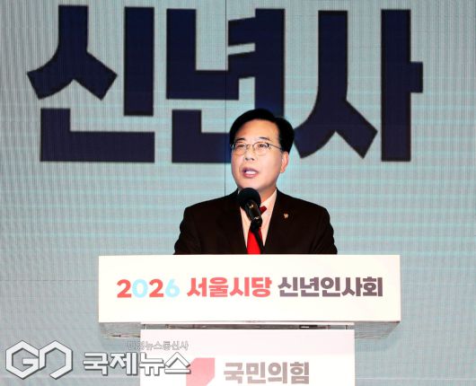 (서울=국제뉴스) 송언석 국민의힘 원내대표가 14일 오전 서울 여의도 중소기업중앙회에서 열린 2026 국민의힘 서울시당 신년인사회에서 신년사를 하고 있다./사진=이용우 기자