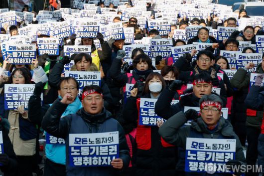 [서울=뉴스핌] 류기찬 기자 = 민주노총 조합원들이 14일 오후 서울 중구 서울지방고용노동청 앞에서 열린 2026 민주노총 신년 결의대회에서 구호를 외치고 있다. 2026.01.14 ryuchan0925@newspim.com