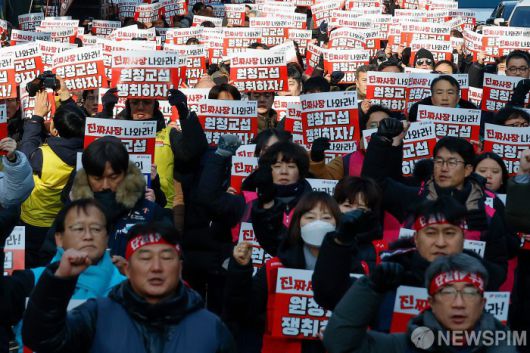 [서울=뉴스핌] 류기찬 기자 = 민주노총 조합원들이 14일 오후 서울 중구 서울지방고용노동청 앞에서 열린 2026 민주노총 신년 결의대회에서 구호를 외치고 있다. 2026.01.14 ryuchan0925@newspim.com