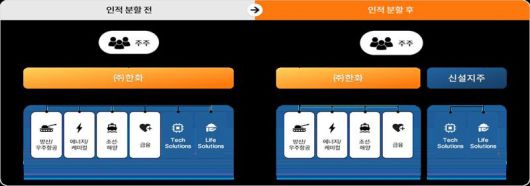앞서 한화그룹 지주사 격인 ㈜한화는 방산, 조선·해양, 에너지, 금융 부문이 속하는 존속법인과 테크 및 라이프 부문을 담당하는 신설법인으로 인적 분할한다고 밝혔다.