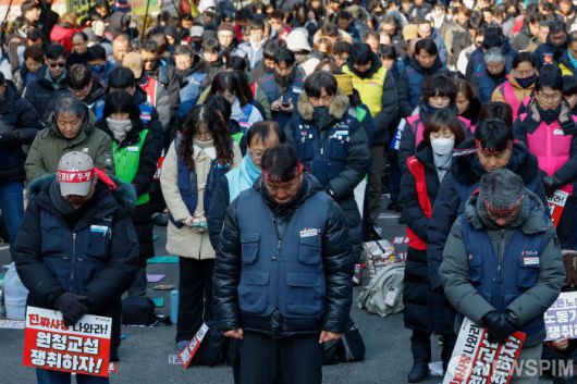 [서울=뉴스핌] 류기찬 기자 = 민주노총 조합원들이 14일 오후 서울 중구 서울지방고용노동청 앞에서 열린 2026 민주노총 신년 결의대회에서 묵념을 하고 있다. 2026.01.14 ryuchan0925@newspim.com