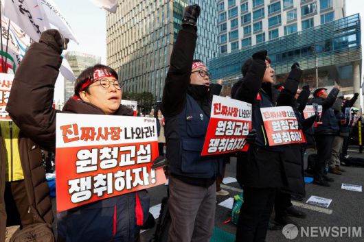 [서울=뉴스핌] 류기찬 기자 = 민주노총 조합원들이 14일 오후 서울 중구 서울지방고용노동청 앞에서 열린 2026 민주노총 신년 결의대회에서 구호를 외치고 있다. 2026.01.14 ryuchan0925@newspim.com