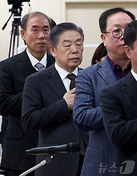 (세종=뉴스1) 김기남 기자 = 김형석 독립기념관장(왼쪽 두번째)이 14일 오후 세종시 정부세종청사에서 열린 국가보훈부 업무보고에 참석하여 눈을 감은채 국민의례를 하고 있다. 2026.1.14/뉴스1kinam@news1.krCopyright ⓒ 뉴스1. All rights reserved. 무단 전재 및 재배포, AI학습 이용 금지.